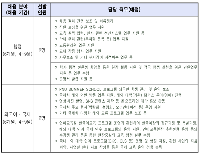 계약기간 : 채용일로부터 6개월 임 용 일 : 2026. 4. 1.(수) 예정 보 수 : 월 2,156,880원 근무시간 : 주 5일, 40시간 응시자격 요건 : 아래의 요건을 모두 충족하는 자 ※ 최종시험(면접) 예정일 기준 [2026. 3. 12.(목) 예정] ㅇ 최종시험(면접)예정일 현재 「청년기본법 제3조」상 청년(19세~34세)의 연령에 해당하는 사람 |
