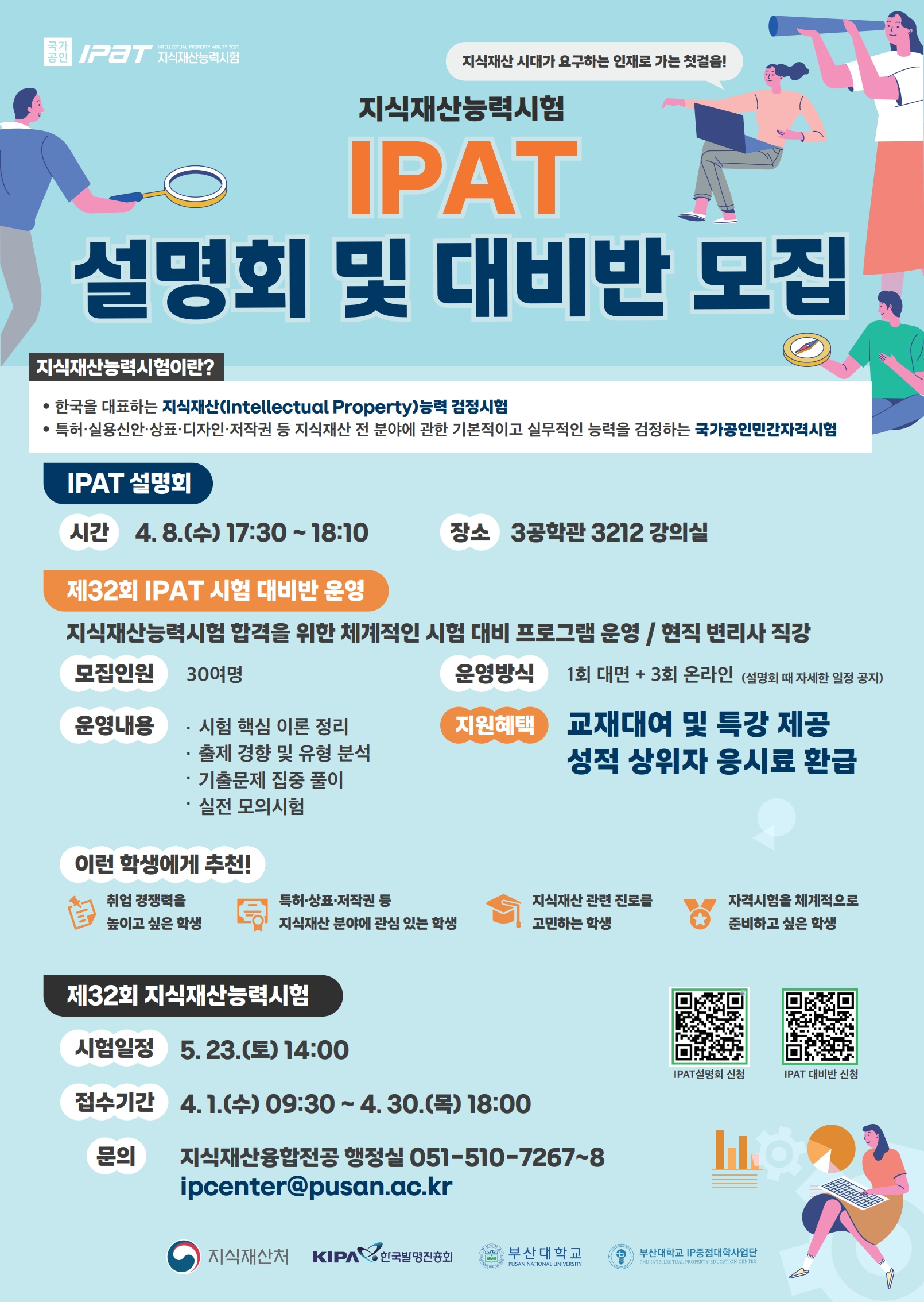 지식재산 분야 국가공인 자격시험인 IPAT 대비를 위한 프로그램으로, 관심 있는 학생들의 많은 참여 바랍니다.