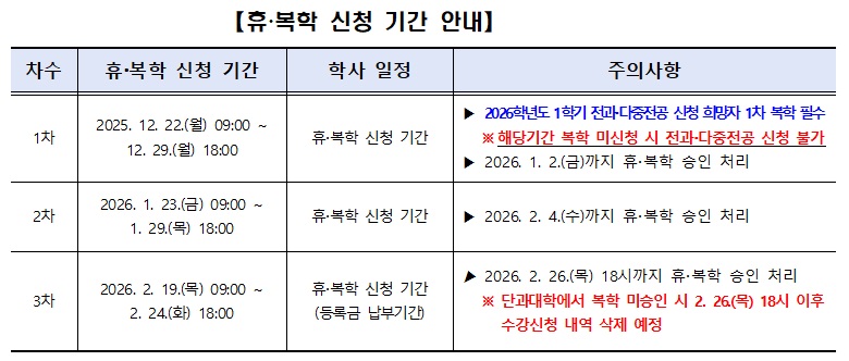 2026학년도 1학기 휴‧복학 신청기간 안내