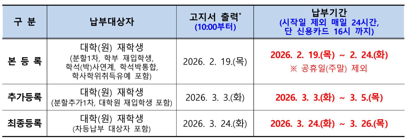 2026학년도 1학기 재학생 등록금 납부 안내